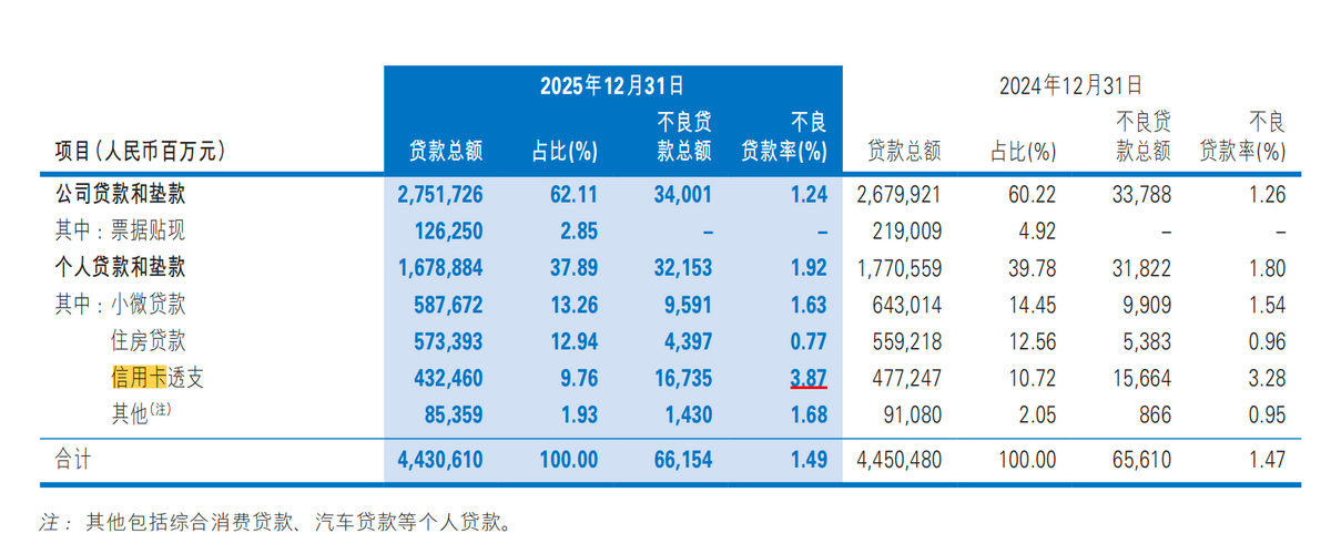 在零售板块,收缩尤为剧烈。2025年,民生银行个人贷款总额下降5.18%,信用卡透支余额更是被大幅压降447.87亿元,信用卡不良率仍高达3.87%。