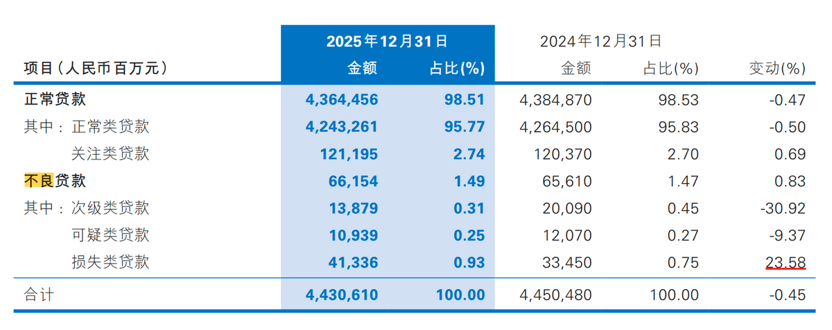 但这场大规模的财务“排雷”行动,并未立即换来资产质量的显著改善。其不良贷款率不降反微升至1.49%,其中损失类贷款余额飙升23.58%,显示风险出清过程仍在持续,且代价高昂。