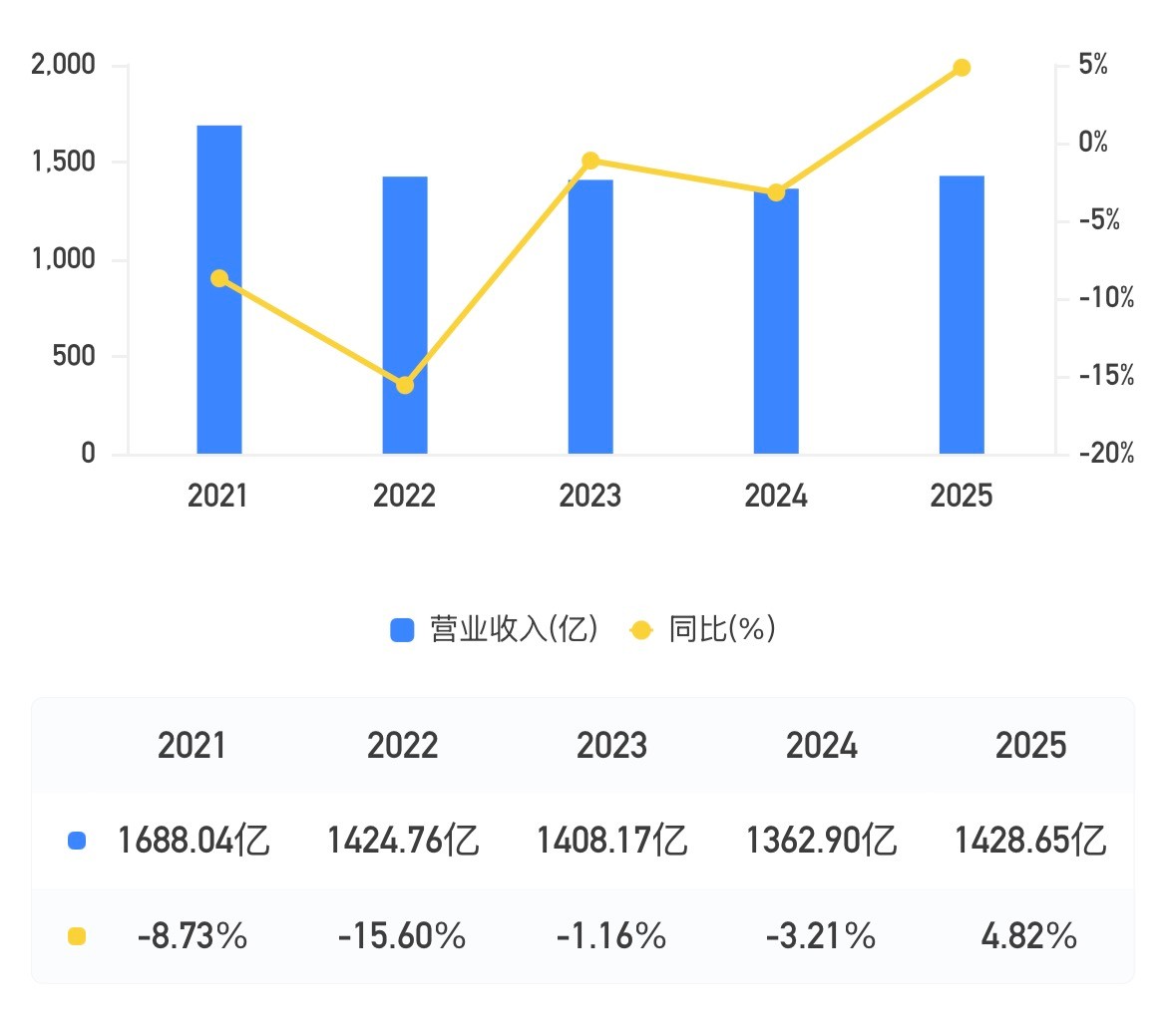 过去五年,该行营业收入从2021年的1688.04亿元,经历连续下滑后,终于在2025年实现4.82%的同比增长,回到1428.65亿元。这标志着其业务规模在经历深度调整后,重新找到了增长动力。