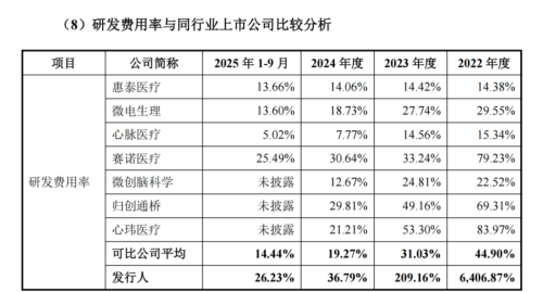 报告期内,公司研发费用率分别为6406.87%、209.16%、36.79%和26.23%,整体高于同行。公司解释,主要系发行人处于商业化初期,收入相对较低且保持较高水平的研发投入所致。2022年度和2023年度,公司研发费用率较高,主要系当期收入较低且2023年股份支付金额较高所致。