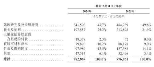 从研发成本构成来看,临床研究及技术服务费是最大支出项,2024年和2025年分别为3.42亿元及4.85亿元,占研发成本的43.7%及49.6%。其次是员工薪金及福利,分别为1.98亿元及2.14亿元,占研发成本的25.2%及21.9%。