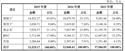 赛克赛斯的收入集中于四款核心产品。可吸收硬脑膜封合医用胶(赛脑宁)、可吸收血管封合医用胶(赛络宁)、手术防粘连液(赛必妥)、复合微孔多聚糖止血粉(瞬时)。报告期内,公司主营业务收入分别为3.76亿元、3.28亿元、3.35亿元,占营业收入的比例分别为99.22%、99.1%、99.12%。其中,赛脑宁收入分别为9201.66万元、1.09亿元、1.44亿元,占主营业务收入的比例分别为24.48%、33.12%、43.01%。