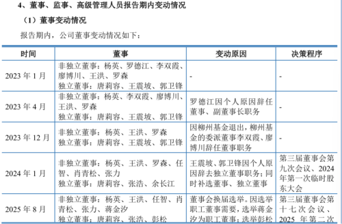 2023年4月,罗德江因个人原因辞任董事、副董事长职务。2023年12月,因柳州基金退出,柳州基金的委派董事李双霞、廖博川辞任董事职务。2024年1月,王震坡、郭卫锋因个人原因辞去独立董事职务;同时补选董事、独立董事。