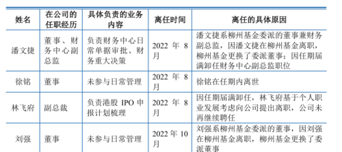 2022年8月,原董事、财务中心副总监潘文捷因任期届满卸任财务中心副总监职位。2022年8月,原副总裁林飞府因任期届满卸任,林飞府基于个人职业发展考虑向公司提出离职,公司未再继续聘任。2022年10月,原董事刘强因在柳州基金离职,柳州基金更换了委派董事。
