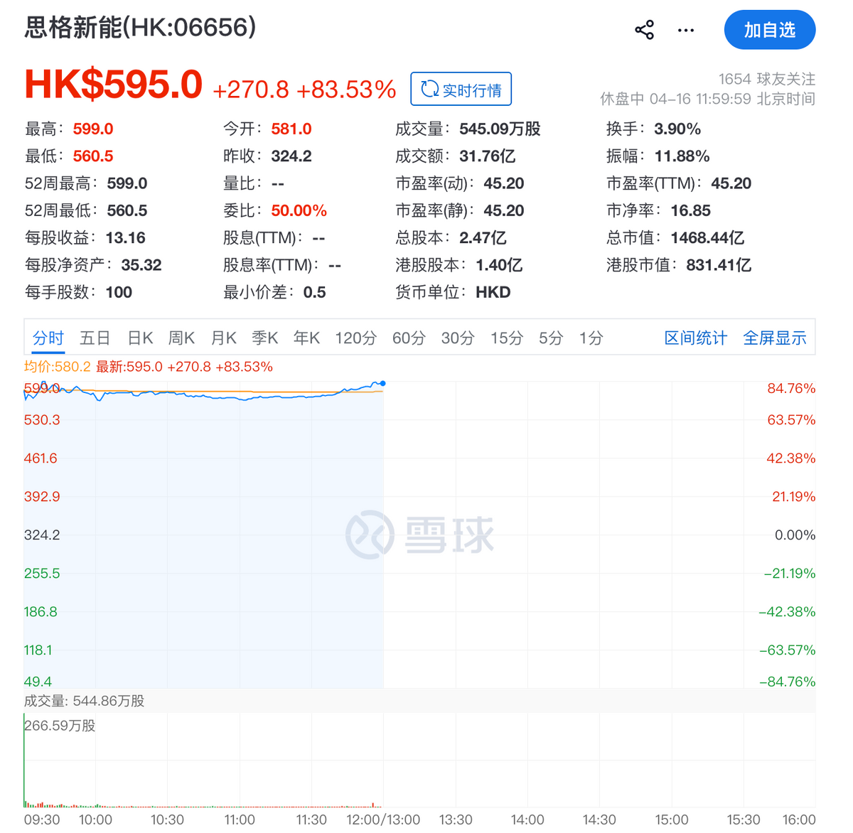 4月16日,思格新能(06656.HK)正式在港交所主板挂牌上市,中信证券与法国巴黎银行为联席保荐人,本次IPO,公司募资超44亿港元。截至上午收盘,思格新能源涨83.53%,报595.00港元/股,市值1468.44亿港元。按每手100股计算,不计手续费,打新投资者每手赚超2.7万港元。
