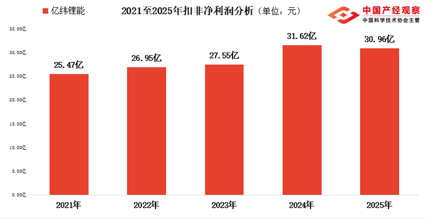 财报数据显示,2025年亿纬锂能实现扣非净利润31.62亿元,较2024年的30.96亿元小幅下滑,尽管跌幅有限,但已然释放出公司主营业务盈利能力转弱的信号,陷入“增收不增利”的经营困境,2025年营收增长了26.44%,达到614.7亿元。
