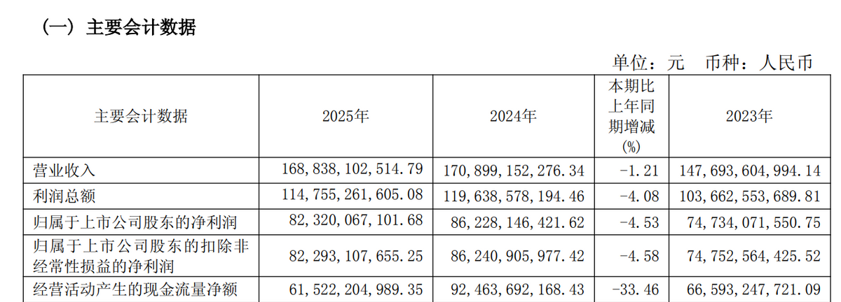 2025年,贵州茅台营收1688.38亿元,同比下降1.21%;归母净利润823.20亿元,同比下降4.53%;扣非净利润822.93亿元,同比下降4.58%;经营活动现金流净额615.22亿元,同比大幅下滑33.46%,核心盈利与现金流均承压。