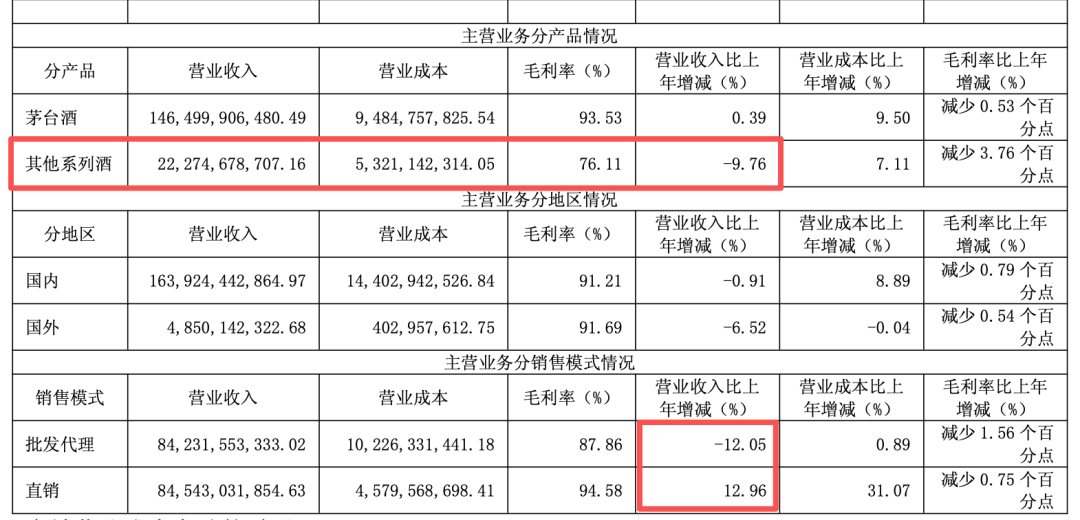 产品结构方面,茅台酒全年营收1465亿元,同比微增0.39%,毛利率93.53%;酱香系列酒营收222.75亿元,同比下滑9.76%,毛利率76.11%。公司表示,本次营收变动主要受酱香系列酒产品结构调整影响。