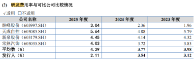 报告期内,双英集团研发费用分别为6879.61万元、9119.54万元及7896.27万元,占营业收入的比例分别为3.12%、3.54%及2.11%。相比之下,同期可比公司研发费用率均值分别为3.98%、3.77%、4.29%,公司研发强度已持续低于行业平均水平。