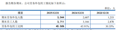 如果说政策红利构成了利润表上的重要支撑,那么成本端的用工结构,则揭示了公司另一条用人逻辑。报告期各期末,双英集团劳务外包人数分别为1,253人、2,687人和3,044人,劳务外包用工占比分别为30.33%、45.91%和45.06%。