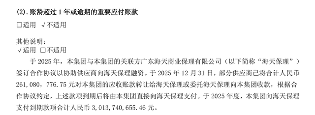 财报中显示,海天味业协助供应商将应收账款转让给海天保理以快速回笼资金,2025年末,公司部分供应商将合计2.61亿元的应收账款转让给了海天保理,2025年度,海天味业向海天保理支付到期款项合计30.14亿元。