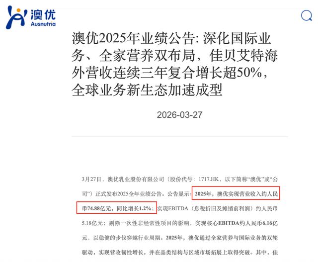 2025年,澳优全年营收74.88亿元,同比增长1.2%。