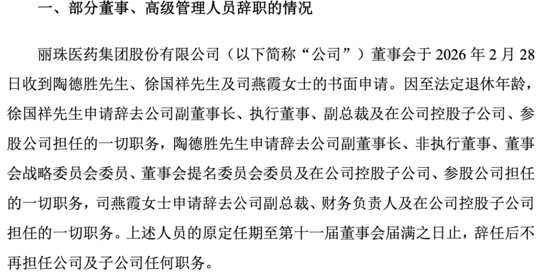 2026年3月初,拥有40年历史的老牌药企丽珠集团宣布了重大的人事变动,三位为公司效力30年老臣徐国祥、陶德胜、司燕霞因退休集体谢幕,分别辞去公司副董事长、执行董事、副总裁等职务,这家老牌药企彻底告别了早期工业制药时代的余晖。