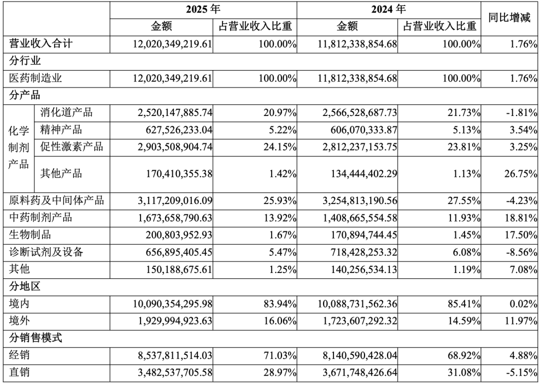 这三大传统板块合计撑起了公司收入的七成以上。相比之下,被赋予厚望的生物制品板块,在经历多年研发投入与战略倾斜后,2025年的收入占比仅为1.67%。
