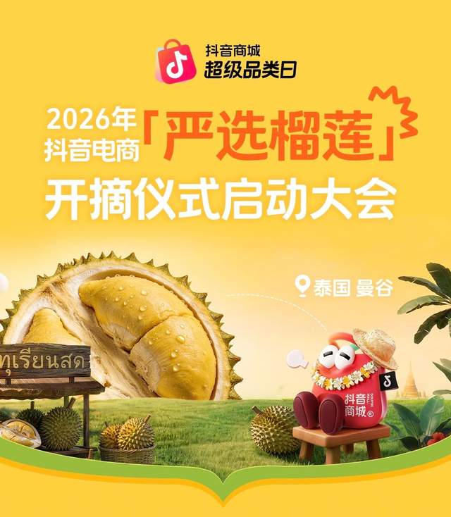 4月22日,抖音电商2026“严选榴莲季”启动仪式在泰国曼谷落地。本次活动由抖音电商主办,国际榴莲协会、顺丰国际协办,平台上70位优质生鲜商家和达人出席了本次活动。