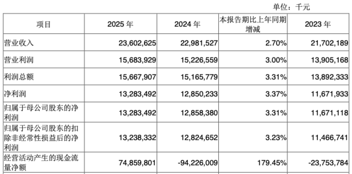 4月22日晚,成都银行(601838.SH)发布了2025年年报。据年报显示,2025年,成都银行营业收入236.03亿元,同比增长2.7%;实现归母净利润132.83亿元,同比增长3.31%;加权平均净资产收益率15.39%。