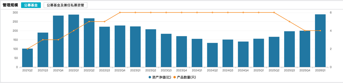 另一方面,资金涌入的速度也极为惊人。基金规模从2025年末的2.54亿元迅速膨胀至2026年一季度末的120亿元,短短一个季度,规模增长近47倍。与此同时,唐晓斌整体在管规模也从2025年末的200亿元升至2026年一季度末的290亿元。