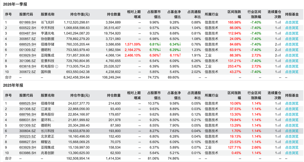 而到了2026年一季度,前十大重仓仅剩下佰维存储、德明利、亚翔集成三只。其余标的全部更换为光通信与算力基建产业链个股:长飞光纤、中天科技、亨通光电占据前三大重仓席位,协创数据、宏景科技、杭电股份等数据中心相关标的也进入前十大。