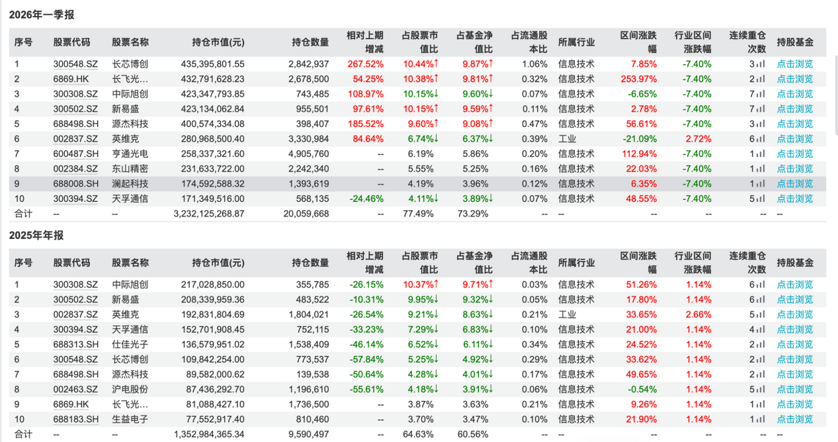 首先,基金对AI硬件产业链的核心标的进行了大幅加仓,长芯博创、长飞光纤、新易盛、源杰科技等持仓显著提升。