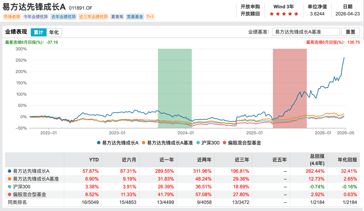 Wind显示,截至4月23日,易方达先锋成长近一年收益率289.55%,意味着一年前买入这只基金的持有人,目前账面上接近原始资金的四倍。