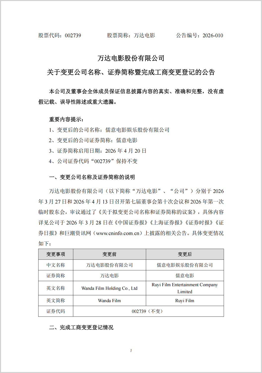 近日,万达电影发布公告称:公司已完成工商变更登记手续,名称变更为“儒意电影娱乐股份有限公司”,证券简称同步变更为“儒意电影”,新简称自4月20日起正式启用,证券代码保持不变。