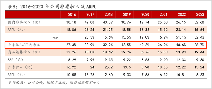 2016-2023年万达电影非票收入及ARPU,图源:小牛行研
