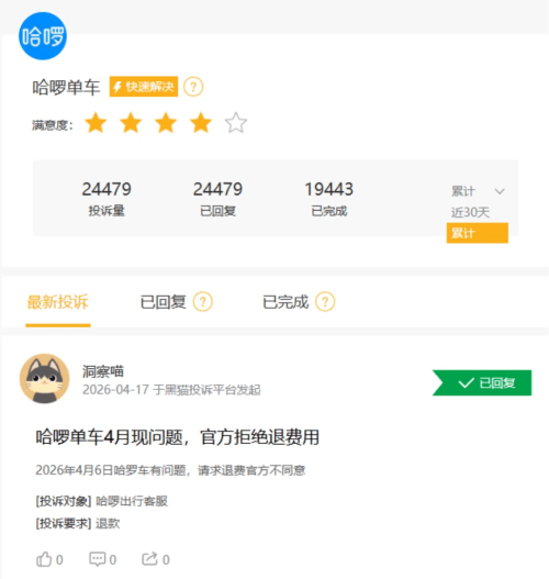 在消费者投诉方面,截至4月24日,哈啰单车在黑猫投诉上的投诉量高达24479条,已完成19443条。