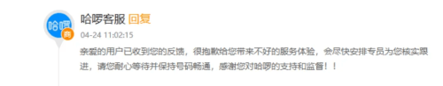 该条投诉在10天后的24日,哈啰客服回复称,亲爱的用户已收到您的反馈,很抱歉给您带来不好的服务体验,会尽快安排专员为您核实跟进,请您耐心等待并保持号码畅通,感谢您对哈啰的支持和监督!