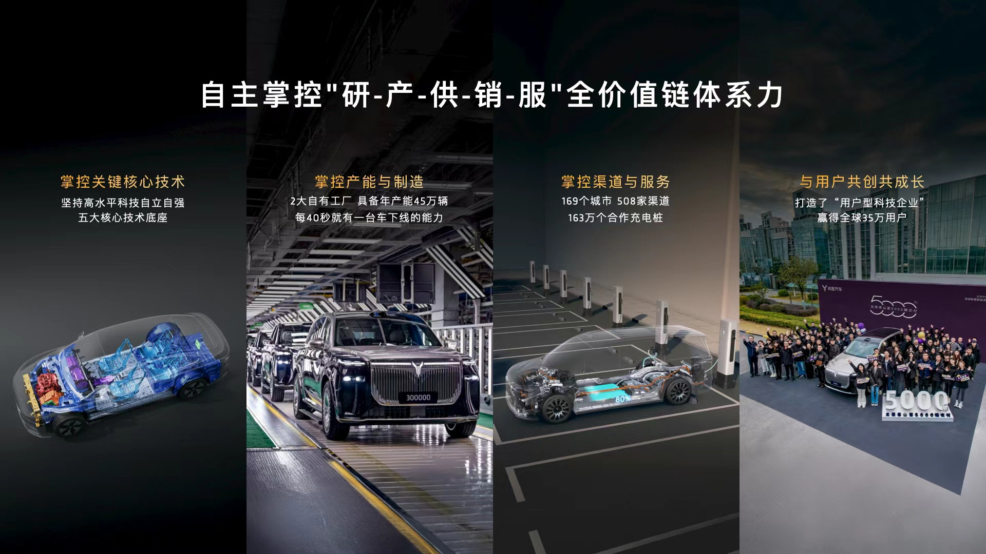 岚图坚持核心技术自主研发,构筑五大坚实技术底座,累计拥有行业领先的6102件专利;同时,岚图自有两座国家级示范工厂,具备年产能45万辆、每40秒就有一台车下线的能力;渠道与服务已覆盖169个城市,508家渠道,163万个合作充电桩,拥有触达用户最后一公里的能力,并建起了跟用户共创共成长的体系,获得了超过35万名用户真诚的喜爱和支持,实现了对“研—产—供—销—服”全价值链的自主掌控。正是因为这种稳定而强大的体系能力,3月19日,岚图在港交所成功上市,成为“央国企高端新能源汽车第一股”。