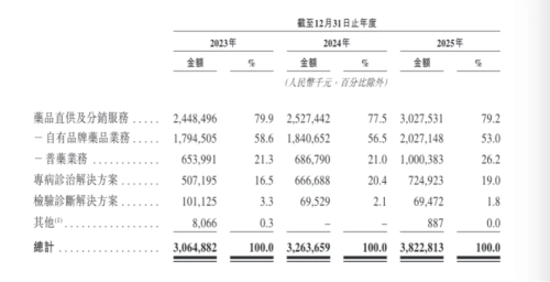 但深入拆解收入结构后,问题一目了然:药品直供及分销服务收入占比分别为79.9%、77.5%和79.2%。其中,自有品牌药品业务约占53%,普药业务约占26%,两者合计撑起近八成的收入。专病诊治解决方案收入占比约19%,而检验诊断解决方案仅约1.8%,几乎可以忽略不计。