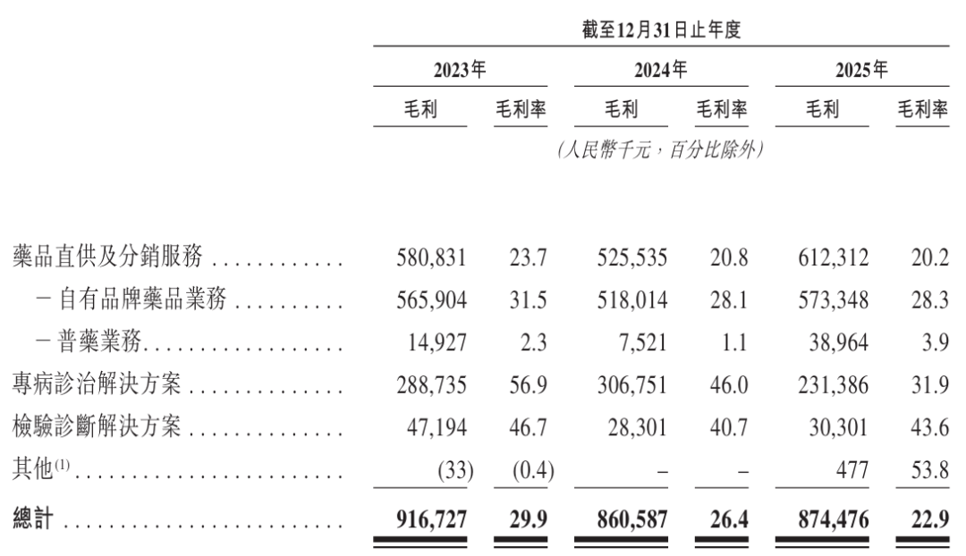 分业务板块来看,药品直供及分销业务作为公司第一大收入来源,2025年贡献了30.28亿元营收,占总收入79.2%,但该业务中的普药业务毛利率极低,仅为1%-4%,几乎处于无利可图的状态。自有品牌药品虽毛利率较高,但其53%的贡献占比仍不足以扭转整体盈利颓势。