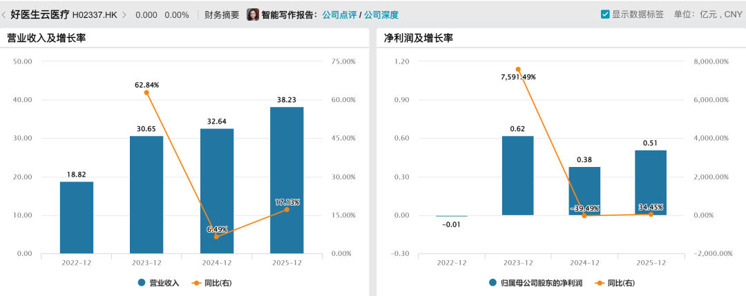 即便业务结构相近,两者经营表现却差距显著:同期好医生云医疗实现营收38.23亿元,净利润仅0.54亿元,无论营收还是净利润规模均明显低于药师帮。