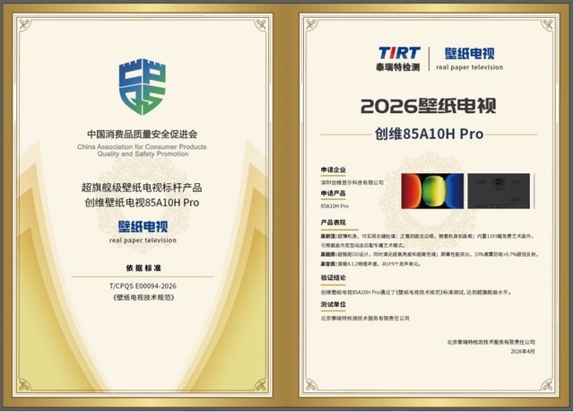 4月18日,“中国消费品质量安全提升系列行动2026”在北京启动,活动由中国消费品质量安全促进会(简称“中消会”)主办,联合国内外知名品牌企业、行业权威机构、核心产业链伙伴,共话品质升级、共推标准落地、共筑消费信心。作为本次行动的重要成果,中消会正式发布《壁纸电视技术规范》(以下简称《规范》),创维壁纸电视A10H Pro顺利通过全项标准测试,成为行业首个践行权威标准的典范,彰显创维品质实力。