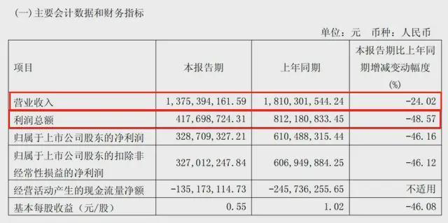 营收13.75亿元,同比降24.02%;净利润3.29亿元,同比降46.16%;经营现金流还是负的1.35亿元。