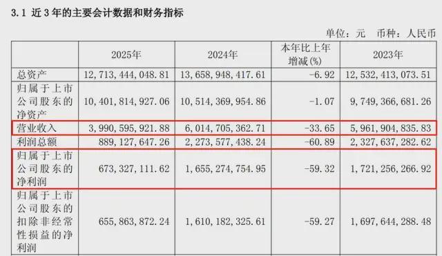 营收39.91亿元,同比下降33.65%;归母净利润6.73亿元,暴跌59.32%。
