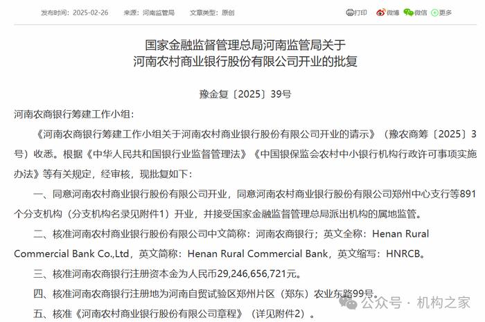 同日,国家金融监管总局河南监管局也发布相关公告,同意河南农商银行开业,同意其郑州中心支行等891个分支机构开业,并接受国家金融监督管理总局派出机构的属地监管。此外,监管核准该行注册资本金为人民币292.47亿元。