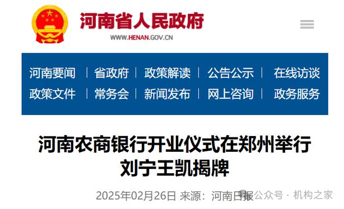 根据河南省人民政府引用河南日报报道,2月26日,河南农商银行开业仪式在郑州举行。省委书记刘宁、省长王凯为河南农商银行揭牌。