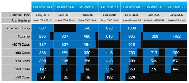 这种图表也让我们能够更好地分析 Ti 型号,而 Ti 型号一直以来并非 Nvidia 产品线的特色。根据核心数量,我们可以说RTX 5070 Ti实际上更像RTX 5060 Ti ,其配置介于历史 70 级和 60 级配置之间,并且比3060 Ti相对于3090 的配置要弱。