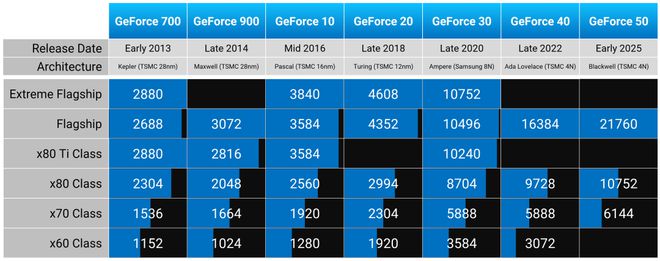 以上是 Nvidia 多年来提供的核心配置:在 50 系列中,RTX 5090提供 21,760 个 CUDA 核心,RTX 5080提供 10,752 个核心,RTX 5070提供 6,144 个核心,而我们现在知道,RTX 5060提供 3,840 个核心。