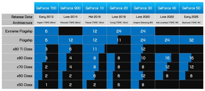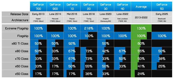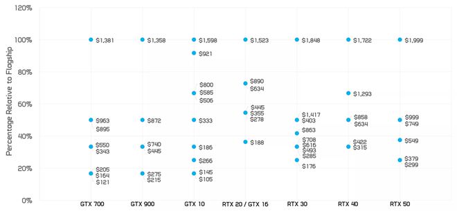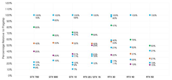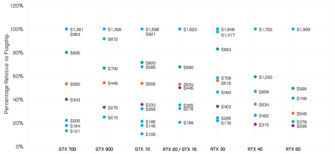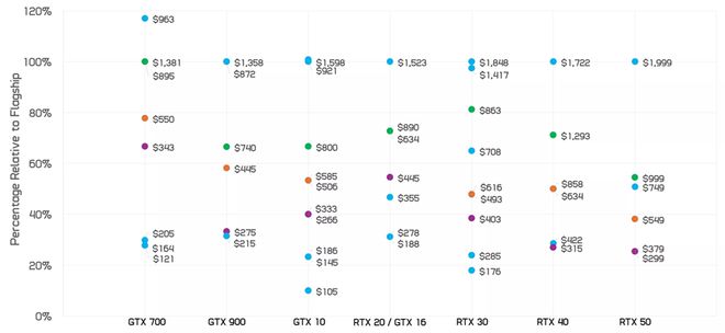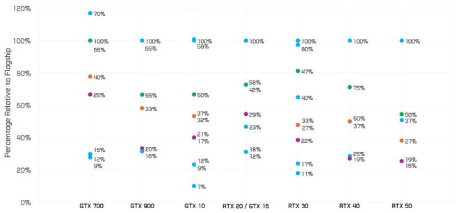 这让我们看到了 GeForce GPU 十年发展历程中,每个产品类别与旗舰型号相比通常缩减了多少。而当你将 RTX 50 系列与典型的一代产品进行比较时,它的表现就不那么出色了。