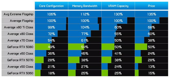 与英伟达旗舰产品相比,RTX 5060 的核心数量仅为 18%,远低于 60 级 GPU 的平均水平。从历史上看,该级别显卡的核心数量平均占旗舰产品的 36%,但4060和 5060 都远远低于这一水平。
