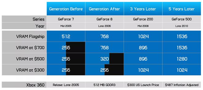 五年后,随着 GeForce 500 系列的推出,两者之间的差距进一步拉大。最低配置为 1,024 MB 显存,而价格与 Xbox 360 相当,显存容量却比主机高出一倍以上——这使得这些 GPU 无论是在当前还是未来的游戏中都表现出色。