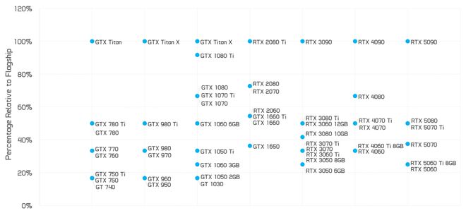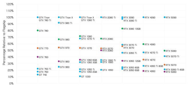 上次我们分析 Nvidia GPU 硬件配置时,使用了 2013 年 GeForce 700 系列的数据,以展示每个产品类别与当时旗舰产品的对比情况。之后,我们利用这些数据创建了一个“典型”的 GPU 代数——即过去六代 GPU 的平均值。