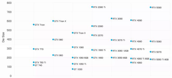 Nvidia GeForce 芯片尺寸(平方毫米):2013 年至 2025 年使用全硅/近全硅的型号