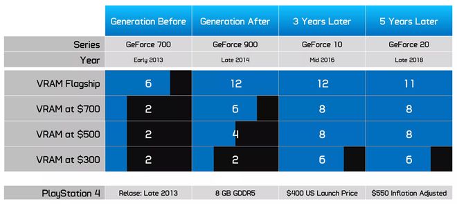 然而,VRAM 分析超越了内部产品线关系,因为 PC 游戏 GPU 是否具有足够 VRAM 的最关键因素之一是它与同时代游戏机及其内存容量的比较。