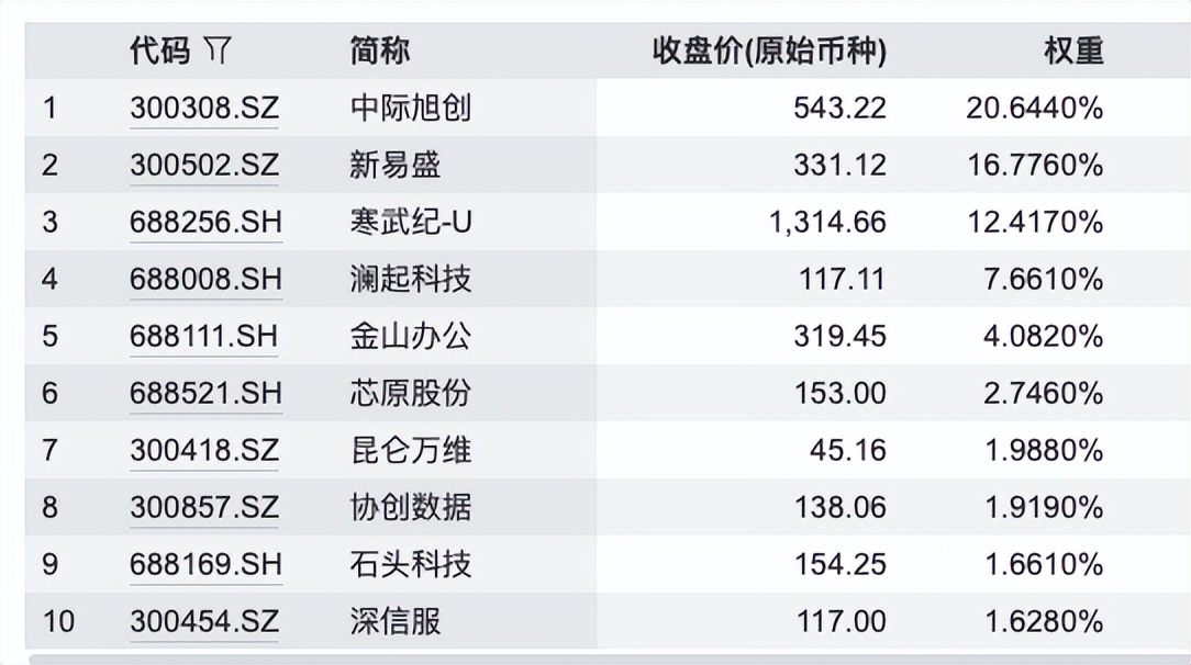 人工智指数覆盖全市场,共50只成分股,根据人工智能业务占比、成长水平和市值规模构建指标体系,以计算机为主,电子和通信为辅,前三大成分股为中际旭创、中科曙光和寒武纪。