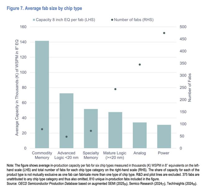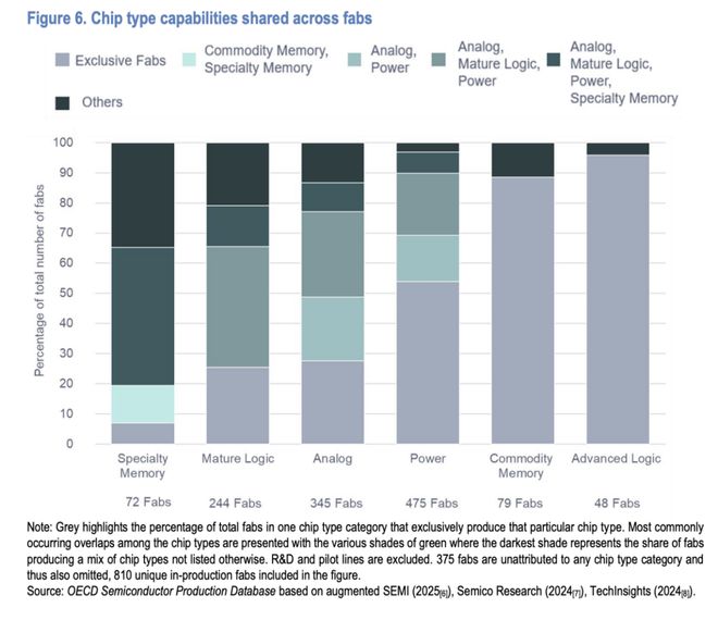 总之,模拟芯片、成熟逻辑芯片和专用存储芯片主要由具备多种工艺技术的晶圆厂生产,这些晶圆厂能够生产不同类型的芯片。然而,对于功率半导体而言,专属制造更为普遍——数据集中的约一半功率半导体晶圆厂只生产此类芯片。通用存储器晶圆厂和先进逻辑晶圆厂高度专业化,通常不具备生产其他类型芯片的能力。