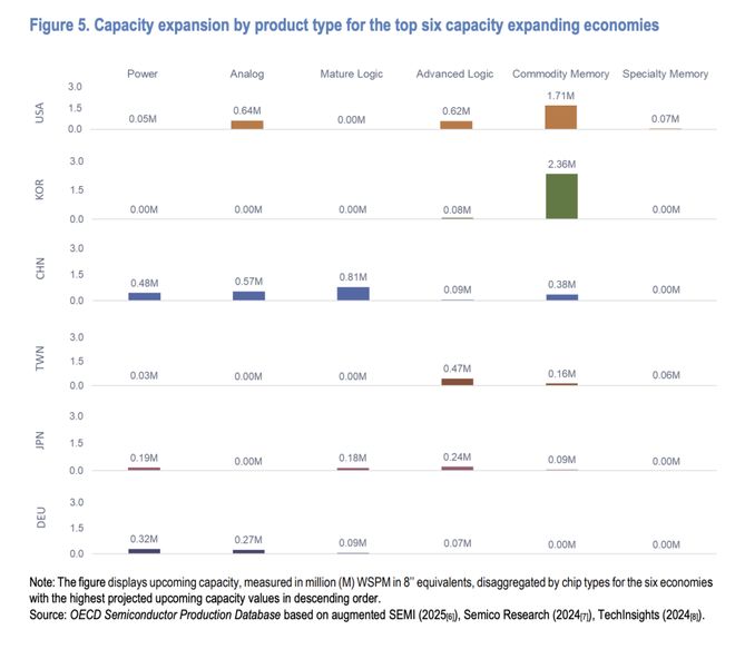 产能扩张潜力并非均匀分布于所有芯片类型和经济体。图 5 更细致地展示了按芯片类型和经济体划分的晶圆产能扩张情况,以便更好地评估