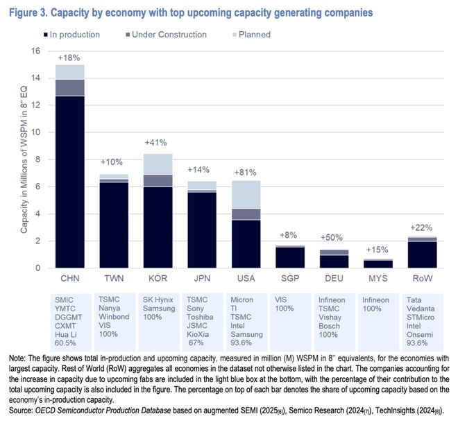 图 3 显示了产能最高的经济体中规划、在建和已投产晶圆厂的产能。大部分产能投资(包括新建和改建项目)都集中在最大的半导体生产经济体,并且主要由在相应地区运营晶圆厂的大型半导体公司推动。产能增长(WSPM)最大的国家是美国、中国、韩国、中国台湾、日本、德国和新加坡。在世界其他地区(RoW),印度的新增产能份额最大。