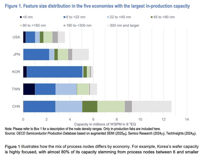 图 1 显示了五个晶圆产能最高的经济体(即中华人民共和、中国台湾、韩国、日本和美国)在七个不同工艺节点密度范围内(详见方框 1)的在产晶圆产能(不包括即将投产的晶圆厂的产能)的地理分布。截至 2025 年 9 月,这五个经济体合计占全球在产晶圆产能的 87%。